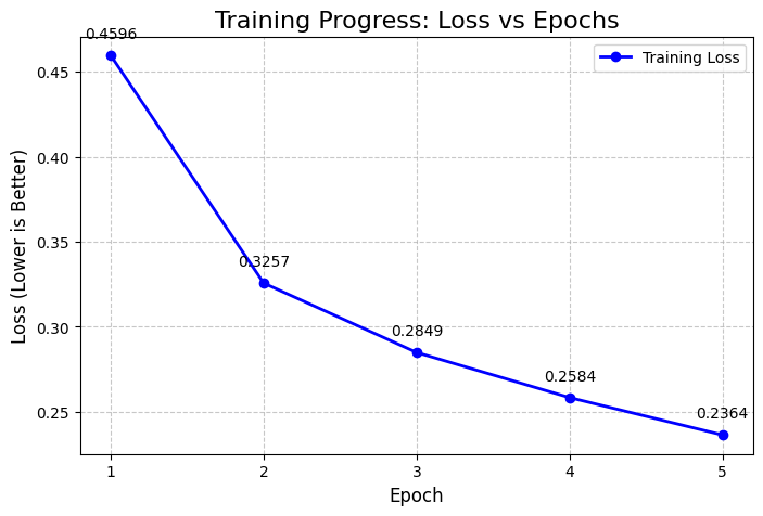 print(f"Epoch {epoch+1} Complete! Average Loss: {running_loss / len(dataloader):.4f}")The training converged well, with the loss dropping from 0.4596 in Epoch 1 to 0.2364 in Epoch 56666.